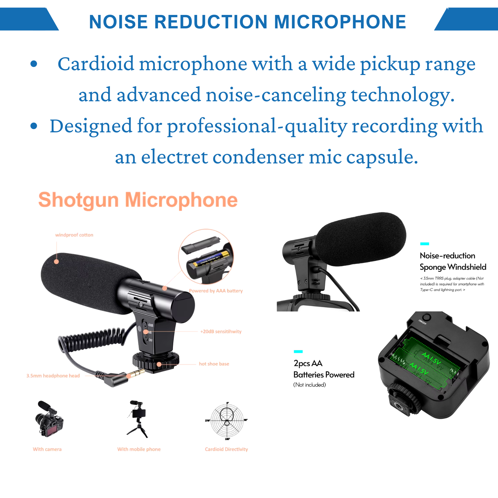 Absolutely! The noise-canceling microphone is equipped with a super-cardioid polar pattern, capturing clear audio and minimizing unwanted background noise. It’s ideal for interviews, vlogs, and live streaming.