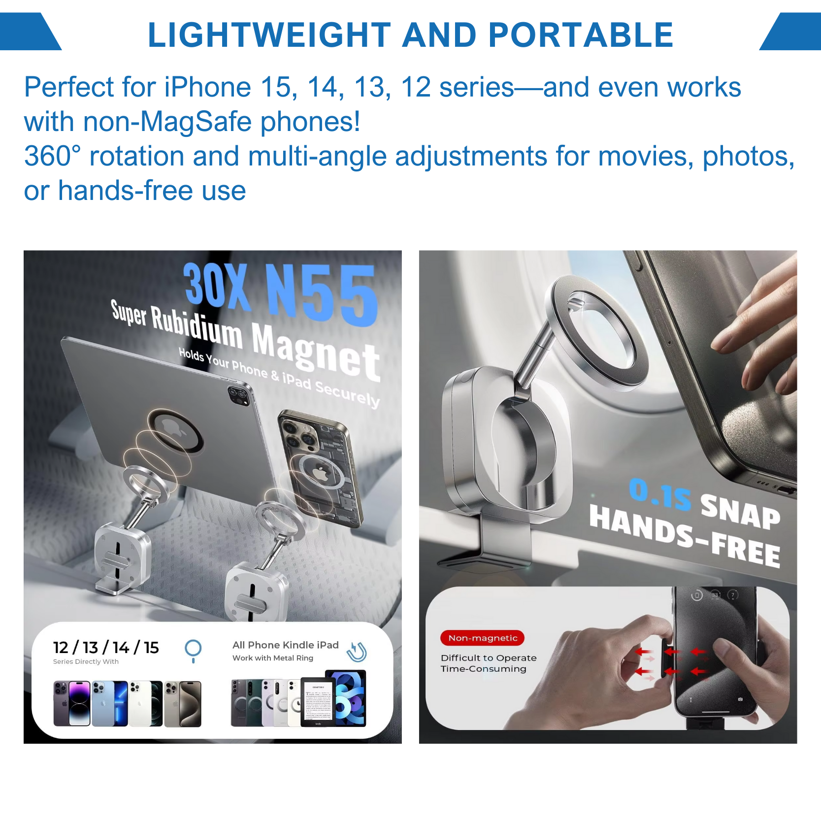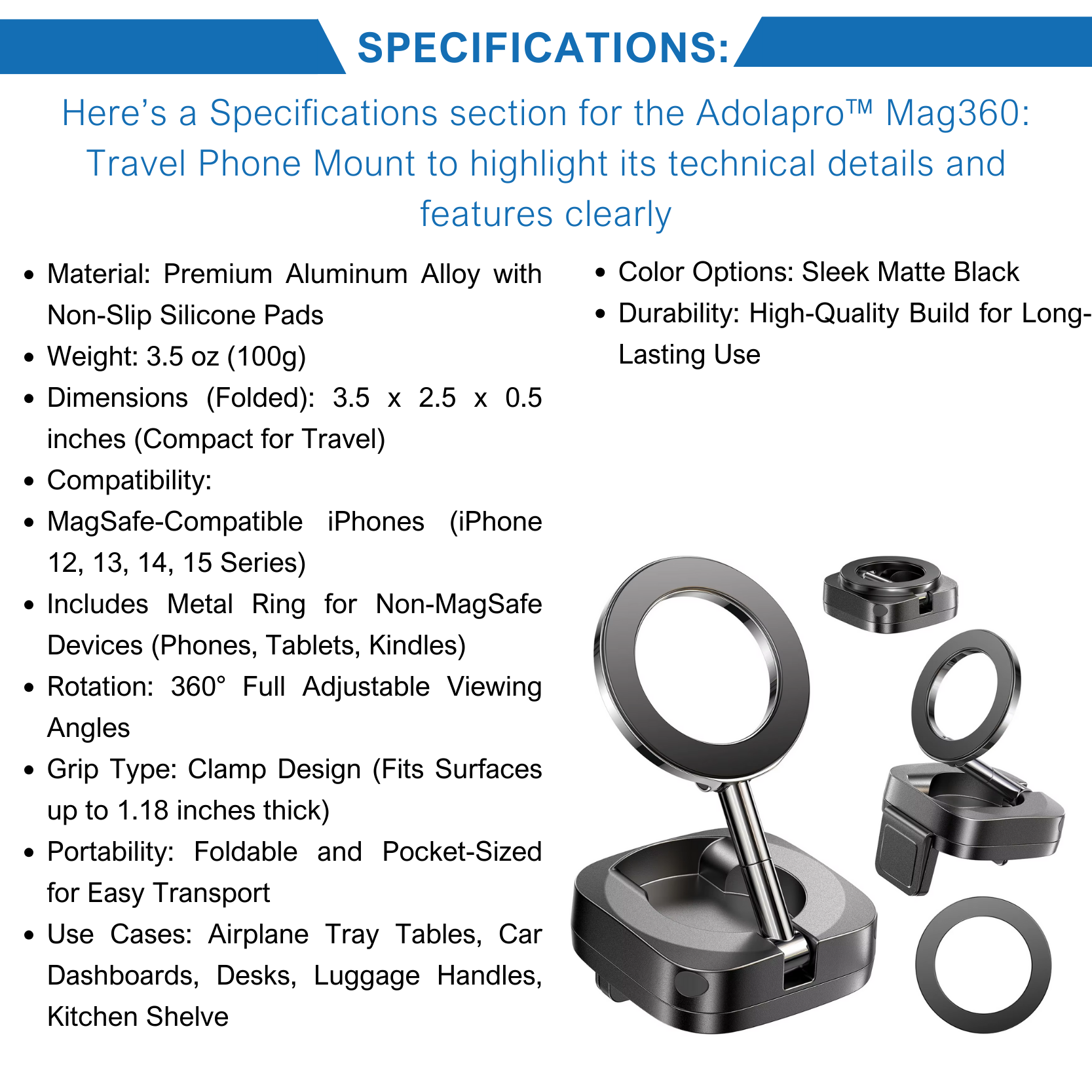 The Adolapro™ Mag360 is ultra-lightweight (3.5 oz) and features a foldable design that fits in your pocket or bag. It’s the perfect travel companion for flights, road trips, and daily use.