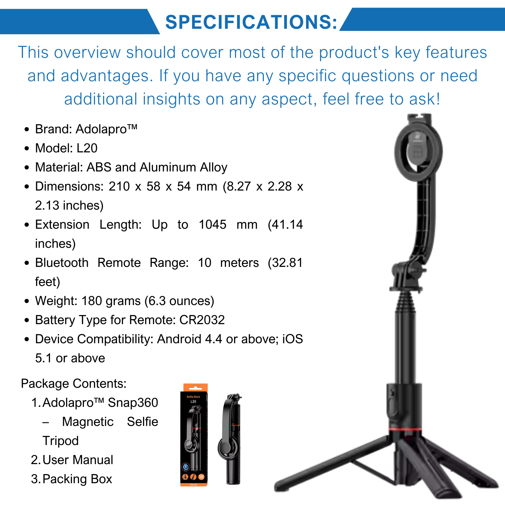 Unlock your full creative potential with the Enhance every moment of your journey with the Adolapro™ Snap360 – Magnetic Selfie Tripod. From capturing unforgettable angles to delivering hands-free convenience with a simple Bluetooth remote, this product is more than just a tripod – it’s an essential companion for creativity and adventure.