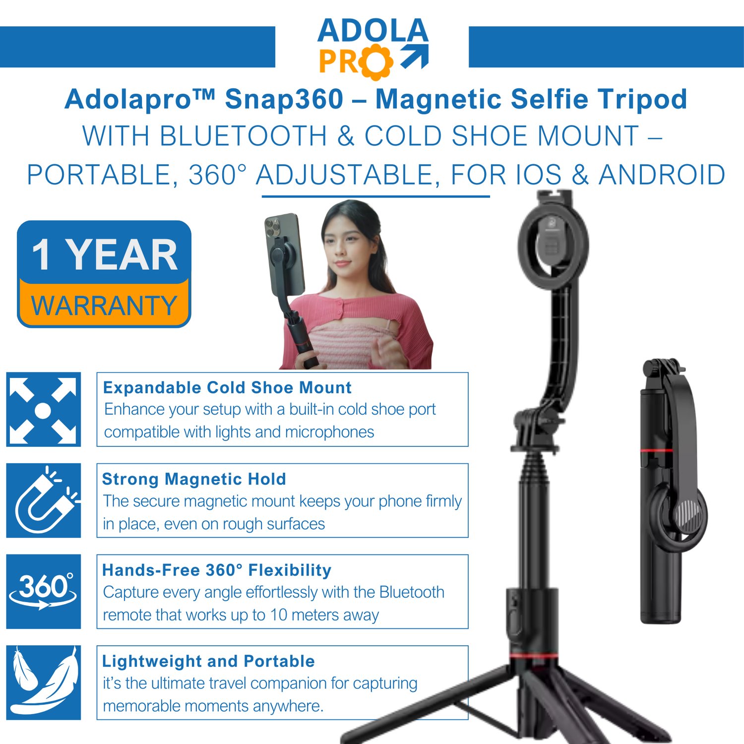 Unlock your full creative potential with the Enhance every moment of your journey with the Adolapro™ Snap360 – Magnetic Selfie Tripod. From capturing unforgettable angles to delivering hands-free convenience with a simple Bluetooth remote, this product is more than just a tripod – it’s an essential companion for creativity and adventure.